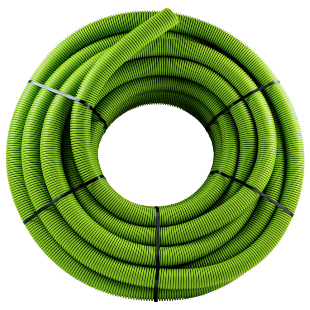 Der flexible Lüftungsschlauch aus geruchsneutralem Polyethylen ist zweischichtig aufgebaut, außen gewellt und mit glatter Innenhaut. Er ist endlos wasser- und luftdicht (nach DIN EN 1610) und kann mithilfe von Klickverbindern und Dichtringen einfach im Estrich oder in der Betondecke verlegt werden.