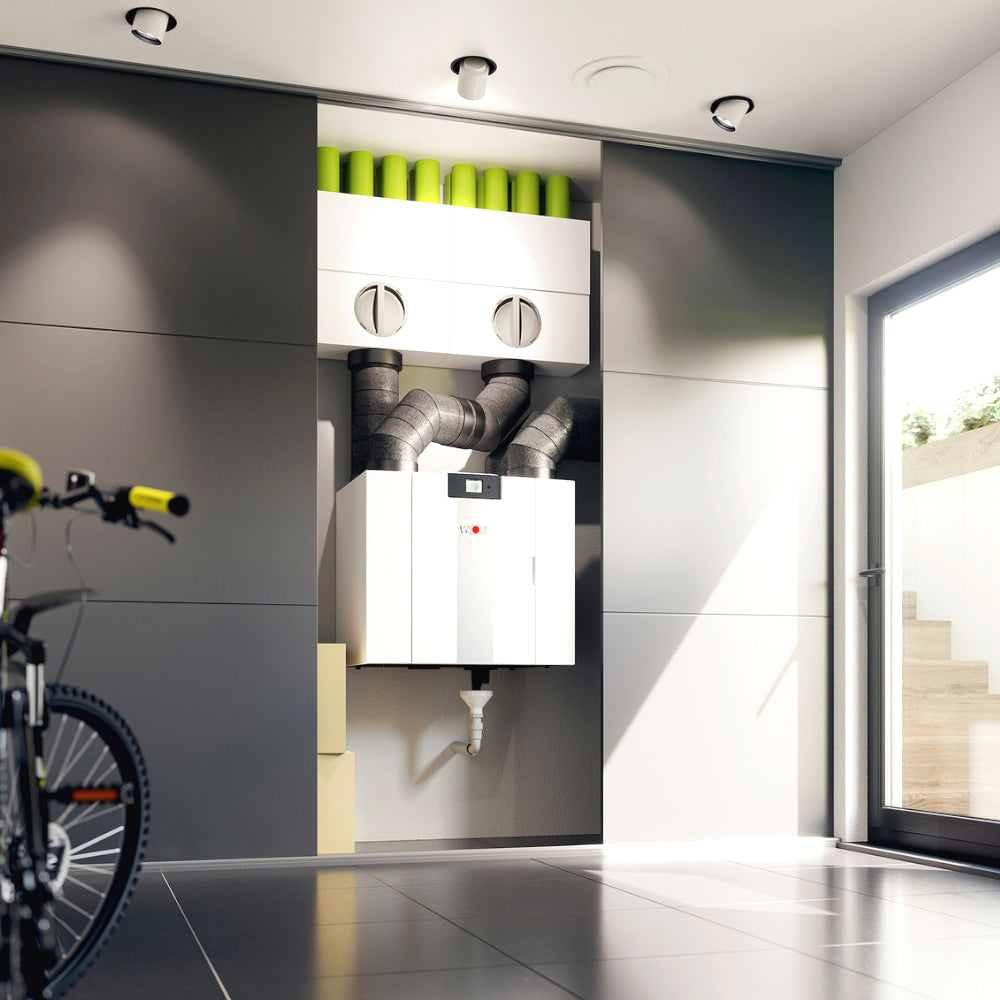 Die passende Antwort auf ein schlechtes Raumklima, gesundheitsschädliche Schimmelbildung, Feuchteschäden oder Wärmeverlust bei Fensterlüftung ist die kontrollierte Wohnraumlüftung. Die Comfort-Wohnraumlüftungssysteme von WOLF übernehmen die komplette Belüftung automatisch und selbständig. Verbrauchte Luft führt das System nach draußen, frische Luft gelangt ins Innere. Zudem wird die Wärme der Abluft mittels eines Kreuz-Gegenstromwärmetauschers dafür genutzt, die einströmende Frischluft vorzuwärmen. So wird Ihr Zuhause automatisch mit sauberer Luft versorgt und Sie sparen zusätzlich Heizkosten ein.