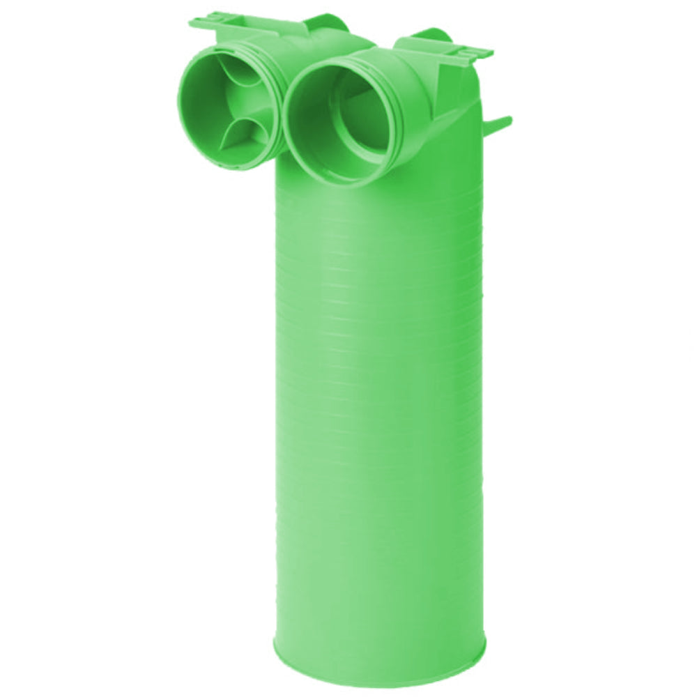 Dieses Anschlussteil ermöglicht den Einbau eines Ventils mit einem Anschlussdurchmesser von 125 mm in das CWL-Luftverteilersystem. Für einen Luftaustritt aus dem betreffenden Ventil bis ca. 30 m³/h ist ein einziger Luftrohrstutzen ausreichend, der andere Stutzen wird dann mit der mitgelieferten Rohrkappe abgeschlossen. Soll der Luftaustritt aus dem Ventil zwischen 30 und 60 m³/h betragen, muss ein zweiter flexibler Luftverteilerschlauch angeschlossen werden.